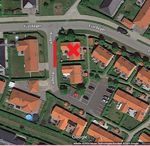 Der er mulighed for parkering på ikke-nummererede pladser. Ved ikke ledige pladser, kan man parkere på sidevejen, markeret med rødt på kortet.